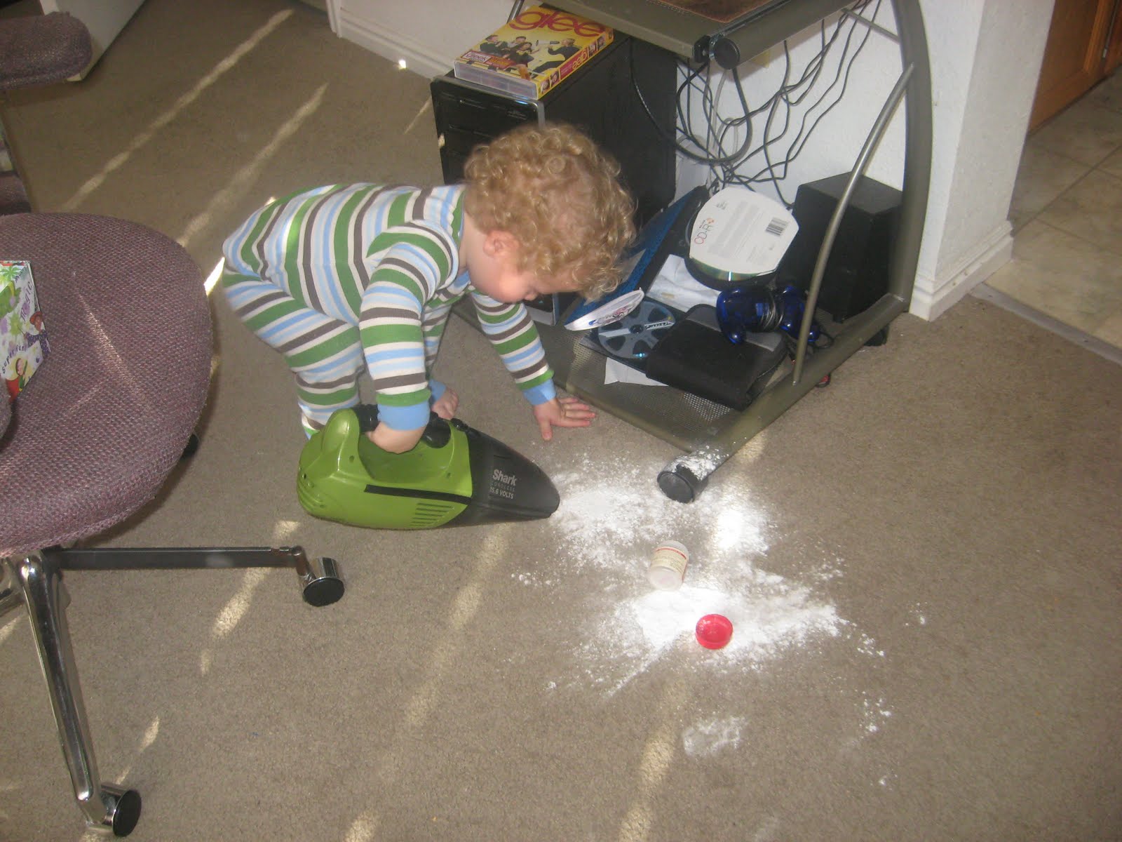 Why do we have kids again? And once we have them how do they make it to adult hood? Ok, I'm just kidding I love my kids but sometimes they are just asking for it. Like today. I had literally just finished vacuuming, and I mean literally. I was in the other room putting the vacuum back in the closet and Jude had dumped a tub of cream of tartar on the floor. Where did he find that? I have never used cream of tartar in my life, I didn't even know I owned it. At first I got mad and put him in time out. I went to go get the hand vacuum and thought..."I didn't make this mess, Jude did. He should clean it up." So I fetched him out of timeout and gave him the vacuum and put him to work. I do love my kiddos and this was a good oppurtunity for a real life lesson. You break it...you fix it.